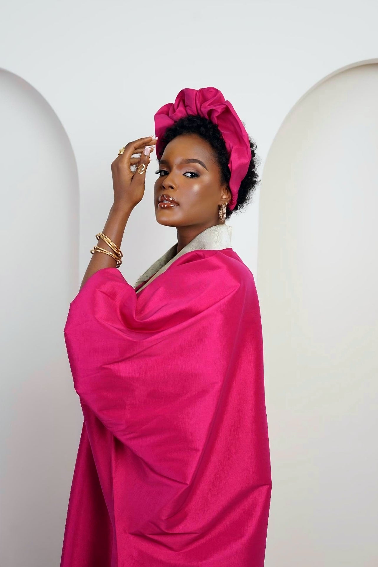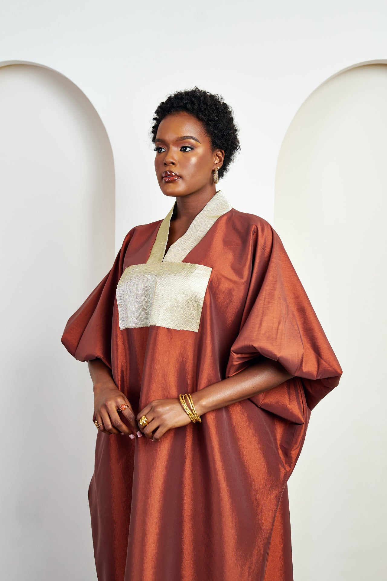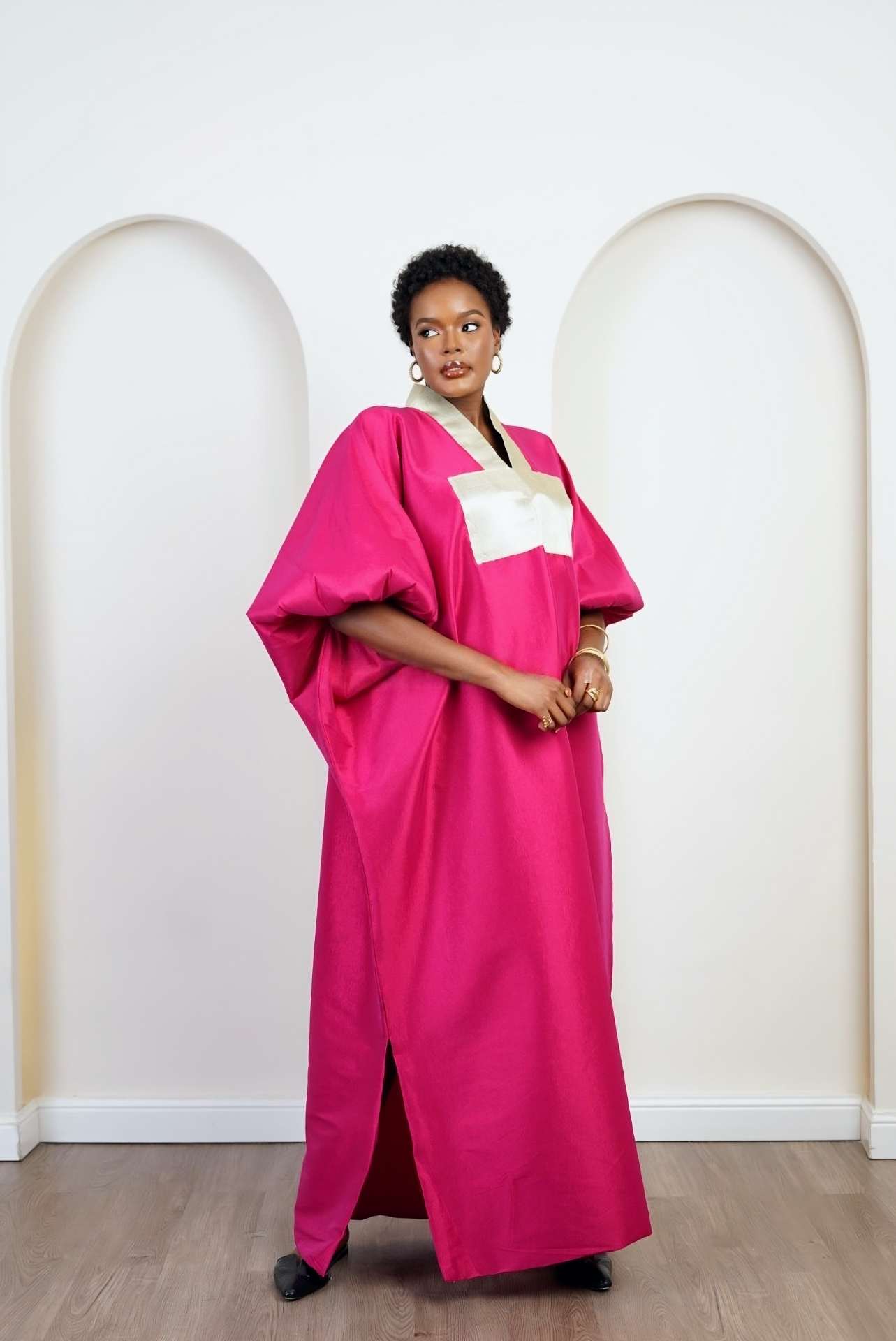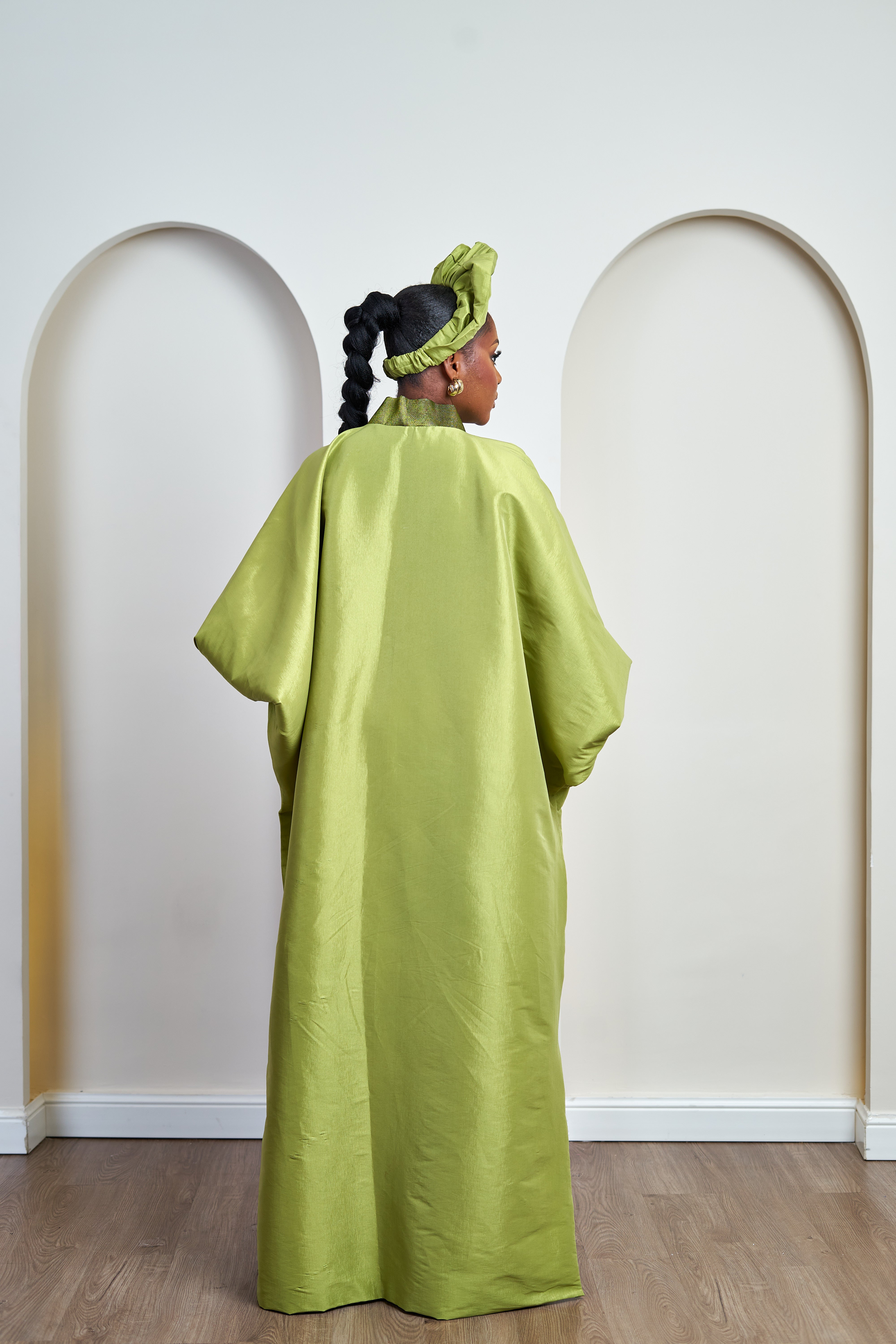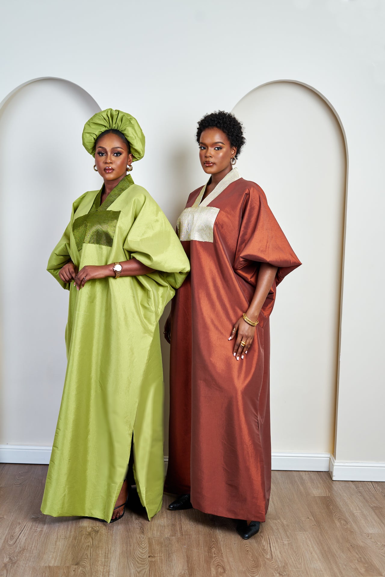 Paired with a matching headband, the Zaria kaftan dress is made from silk fabric, and the neck line and chest made with